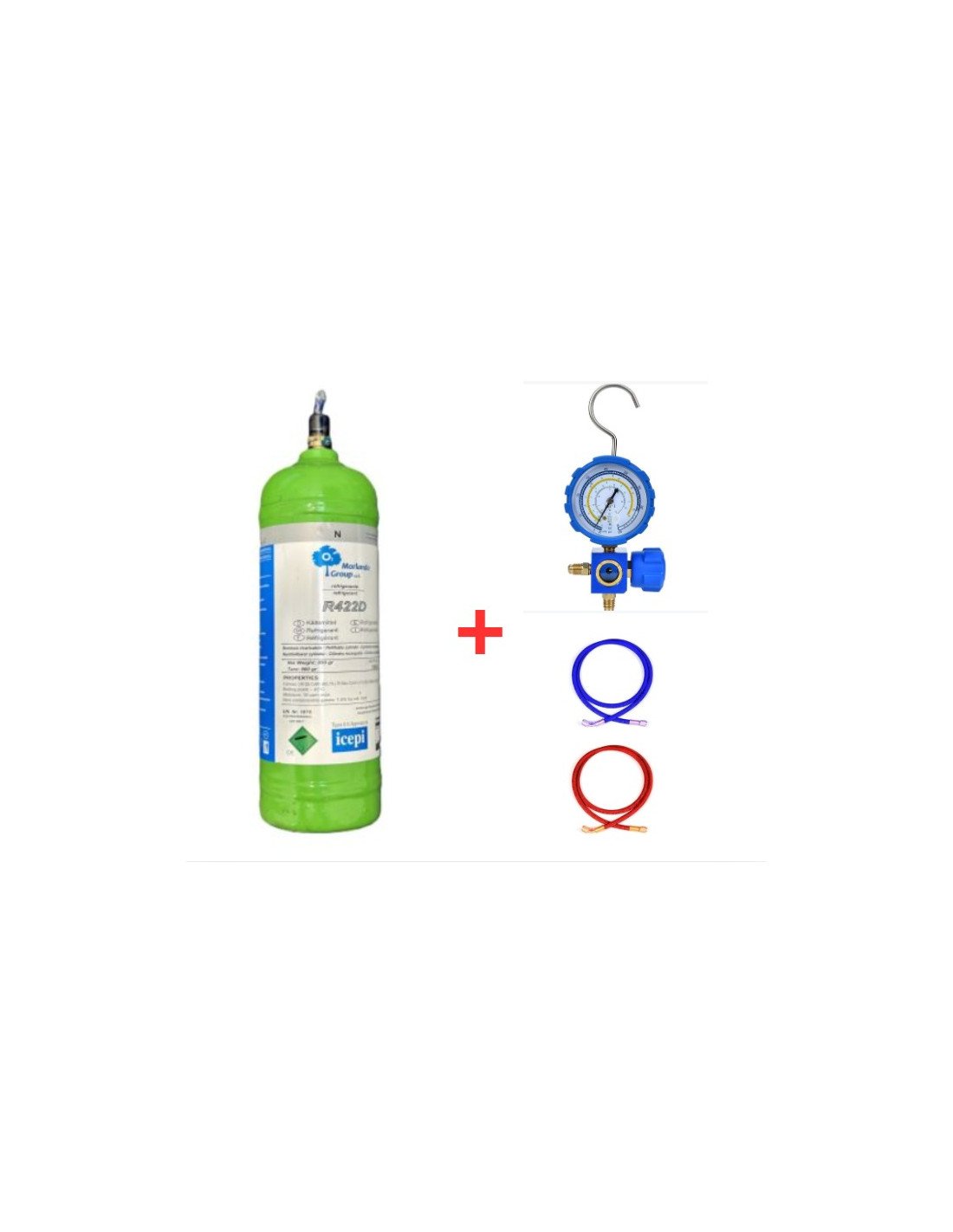 R422D Refrigerant Gas Kit – 2.5 L / 2 kg with ¼ valve, complete with pressure gauge and hoses for maintenance and recharging on refrigeration systems. Ideal for replacing old R22 and for existing systems.