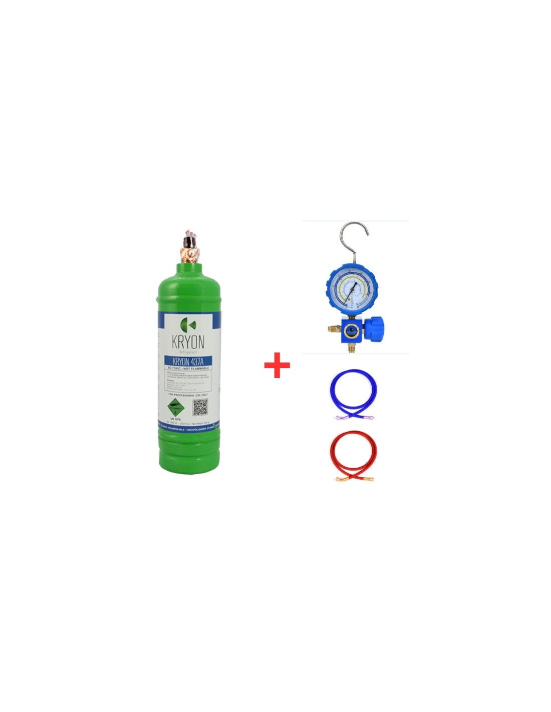 Complete kit with R437A refrigerant gas – 1 L / 0.9 kg, 1/4" valve, hoses and pressure gauge, ideal for the maintenance and recharging of refrigeration systems compatible with R437A.