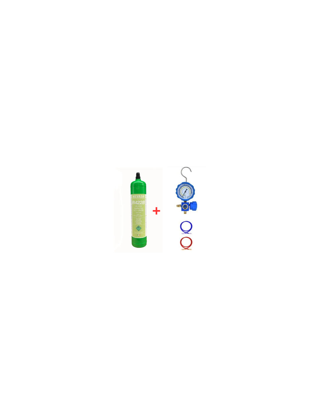 R422B Refrigerant Gas Kit – 2.5 L (2 kg) with 1/4" valve, pressure gauge and hoses. Ideal for recharging and maintaining air conditioning systems replacing R22, it guarantees a secure connection, precise pressure control and ease of use.