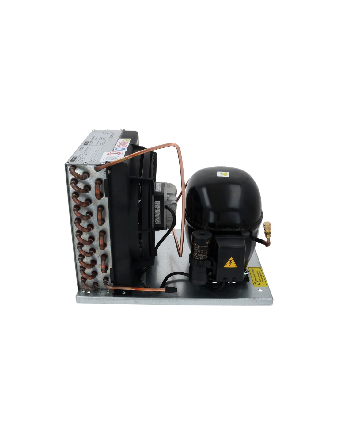 Unidad hermética compacta equipada con un compresor SECOP NL8.4MF, diseñada para aplicaciones de alta/media contrapresión (HMBP). Funciona con refrigerante R134a y cuenta con un sistema de expansión capilar, lo que garantiza fiabilidad y facilidad de mantenimiento.
