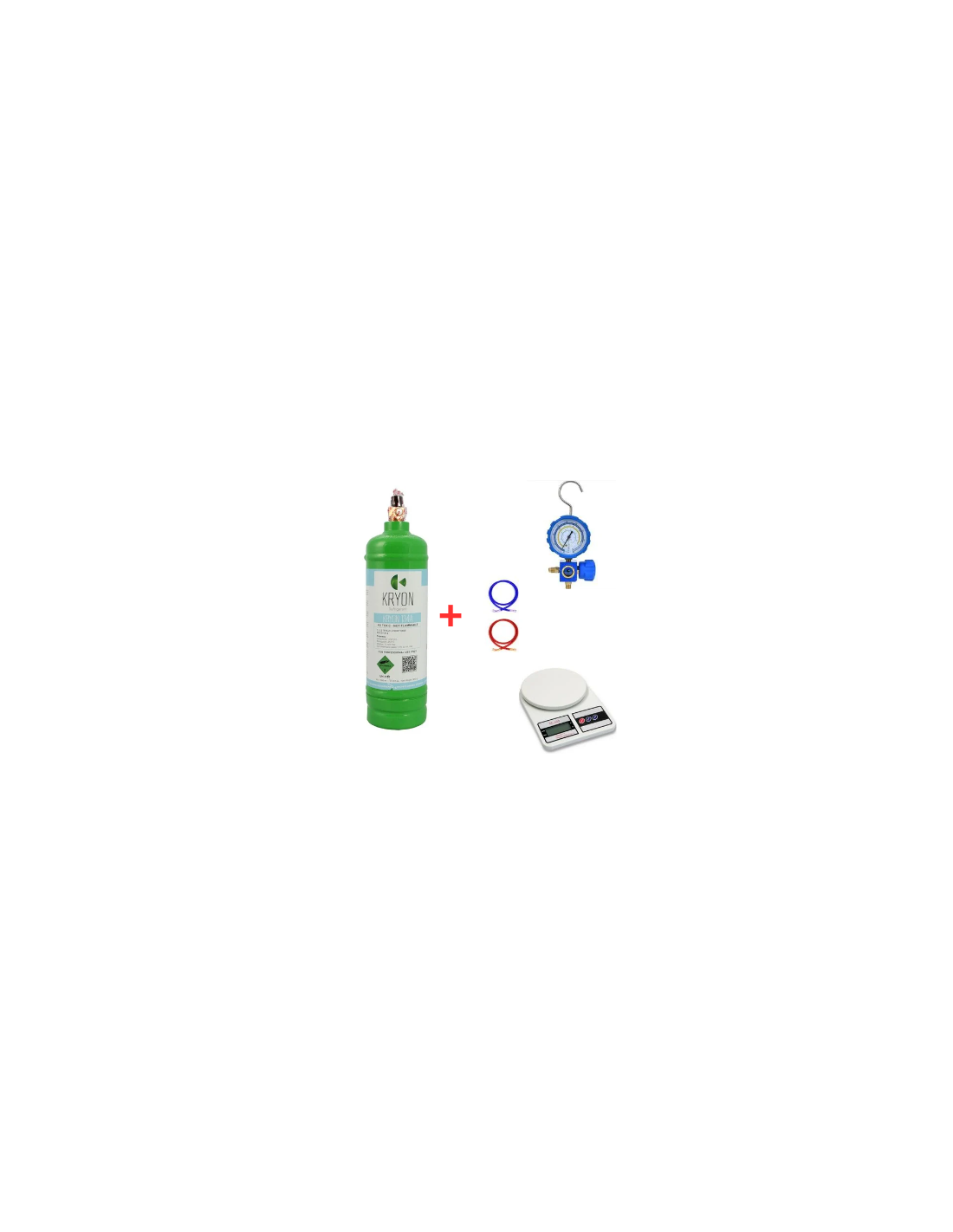 Kit Gas Refrigerante R134a da 1,1 litri (0,9 kg) completo di valvola 1/4, manometro, fruste e bilancia. Ideale per la ricarica e la manutenzione di impianti di climatizzazione domestici e professionali. Soluzione pratica, sicura e pronta all’uso.