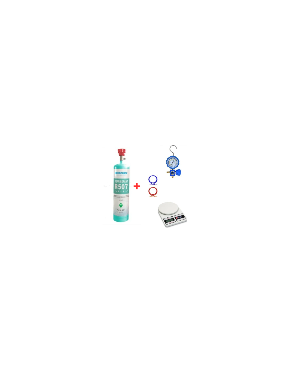 Kit completo per ricarica gas refrigerante R507 da 0,75 kg, bombola da 1 litro con valvola 1/4", fruste, manometro e bilancia elettronica di precisione. Ideale per impianti a media e bassa temperatura, garantisce ricariche sicure e accurate.